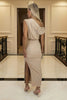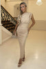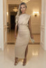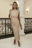 Be the star of this festive season with our champagne sparkle off the shoulder draped top midi dress. Crafted from our premium sparkle fabric, this dress features an open off the shoulder neckline, ruched shoulder detailing, draped effect, a side zip closure, and a ruched sides midi skirt with side split. Pair it with some statement jewellery and heels for the most glamorous party look!