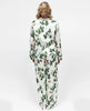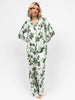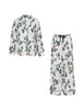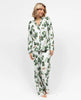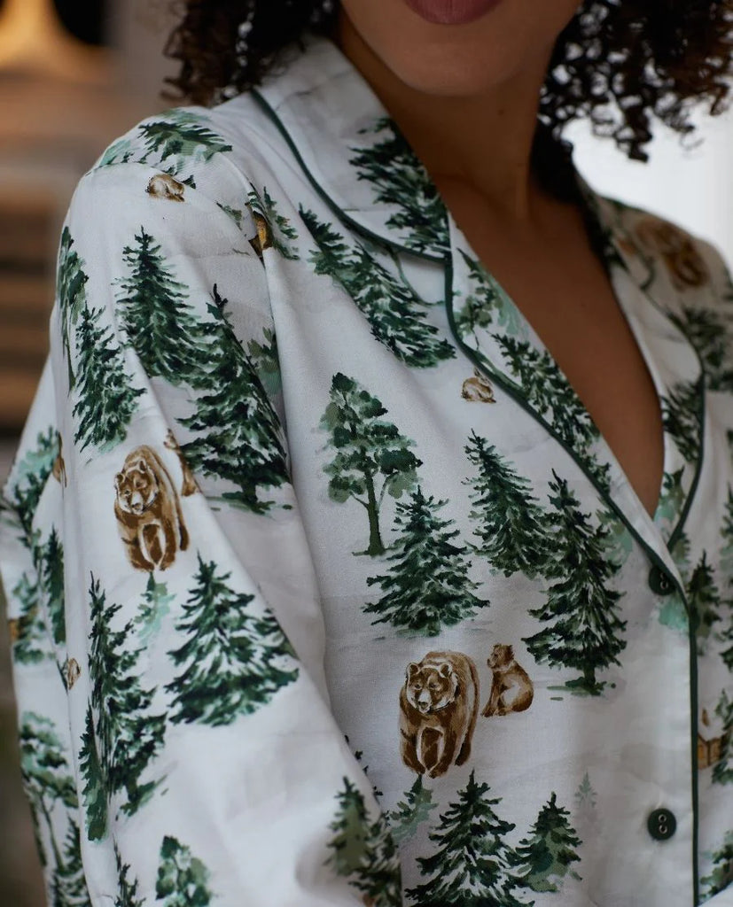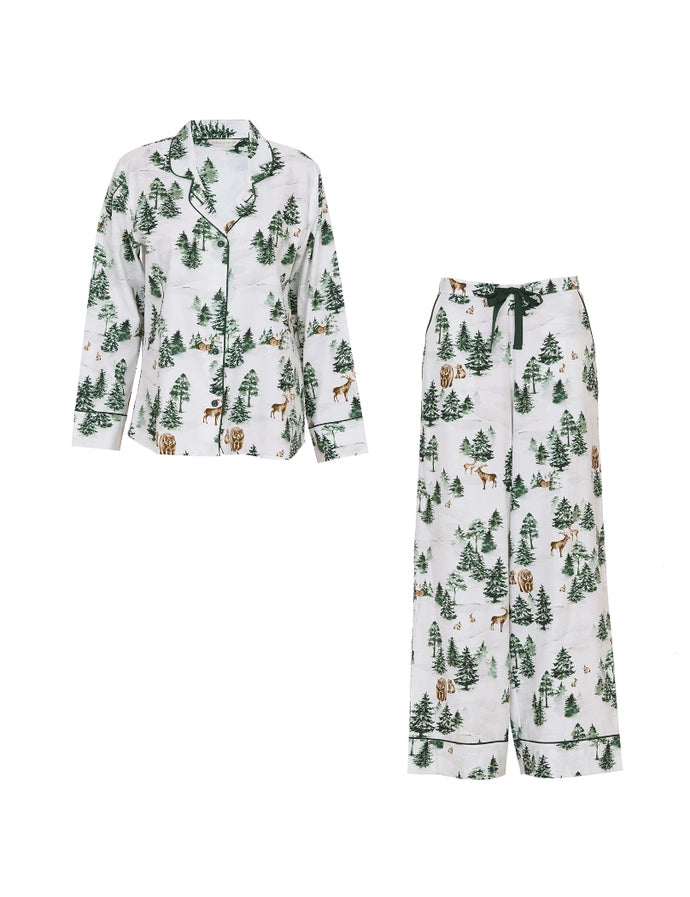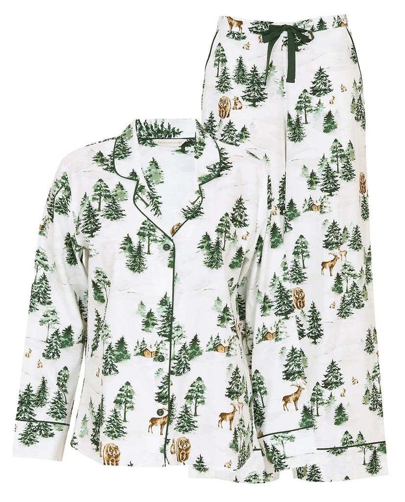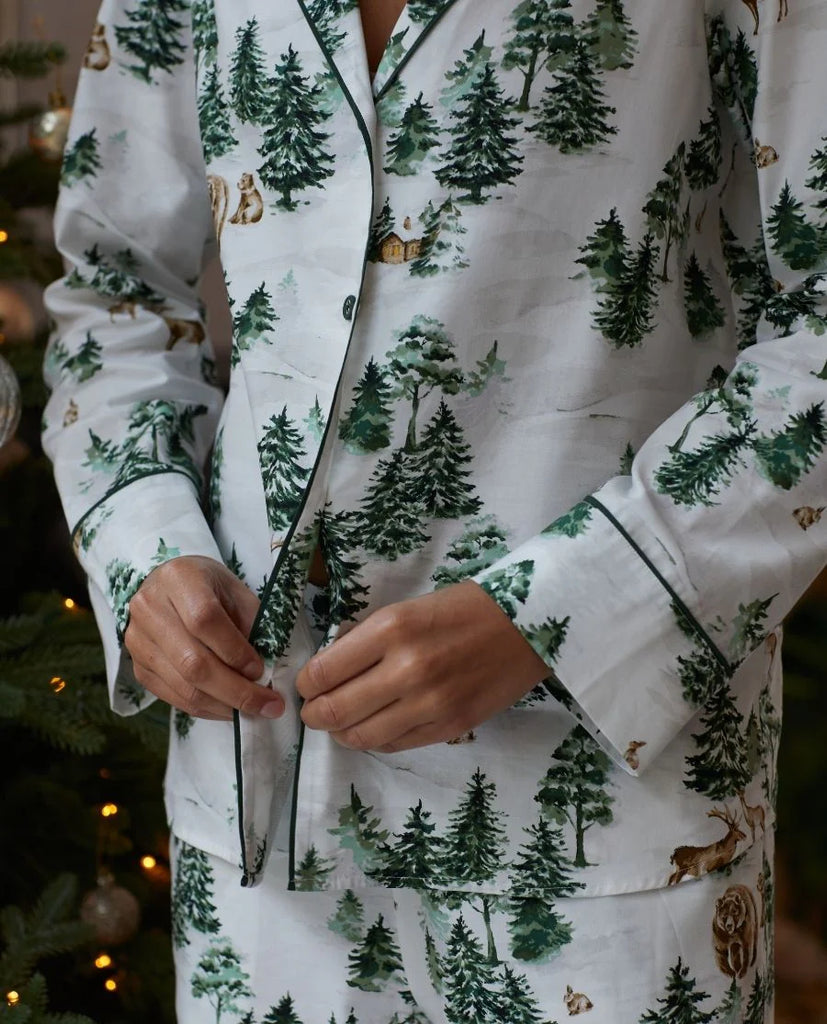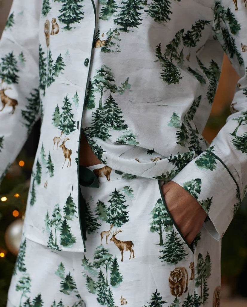 Fern green, alpine print, long sleeve, wide leg pyjama set is your cosy essential for lounging. Crafted in a super-soft blend of 60% cotton and 40% modal, this set feels gentle on the skin. With a serene alpine print of green pine trees, snow-dusted cabins, and woodland animals set against a clean white background, it brings the charm of a winter cabin getaway straight to your sleepwear drawer. The long-sleeved top features a revere collar, olive green functional modal-covered buttons, and matching modal piping to softly edge the opening, cuffs, and hems. The wide-leg pyjama bottoms are equally considered, trimmed in modal and designed with a flat front, elasticated back waistband, and adjustable drawstring for a personalised fit. Two side pockets and straight cuffed hems add functionality and flow, perfect for slow starts and long, lounging afternoons.