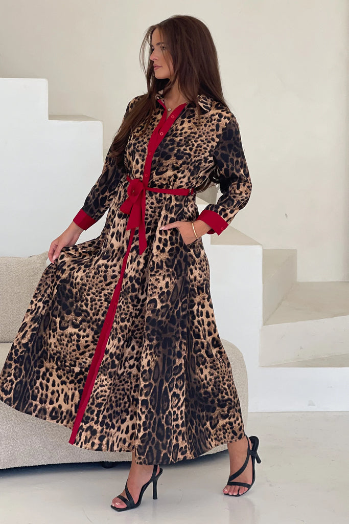 Leopard shirt maxi dress is a must-have in your wardrobe! Featuring button front detailing, bold print and even pockets! The red detail sets this dress off. Pair with court heels for a sophisticated outfit or boots for a casual day.