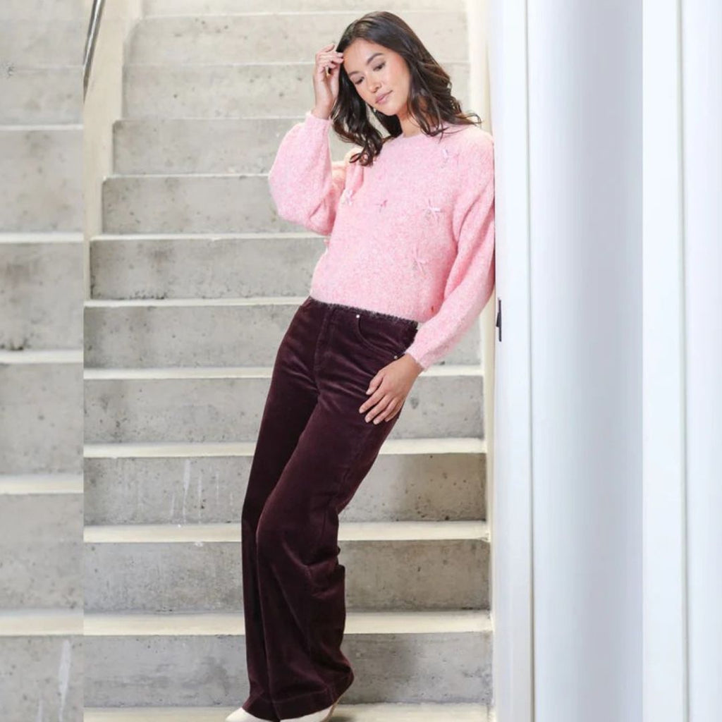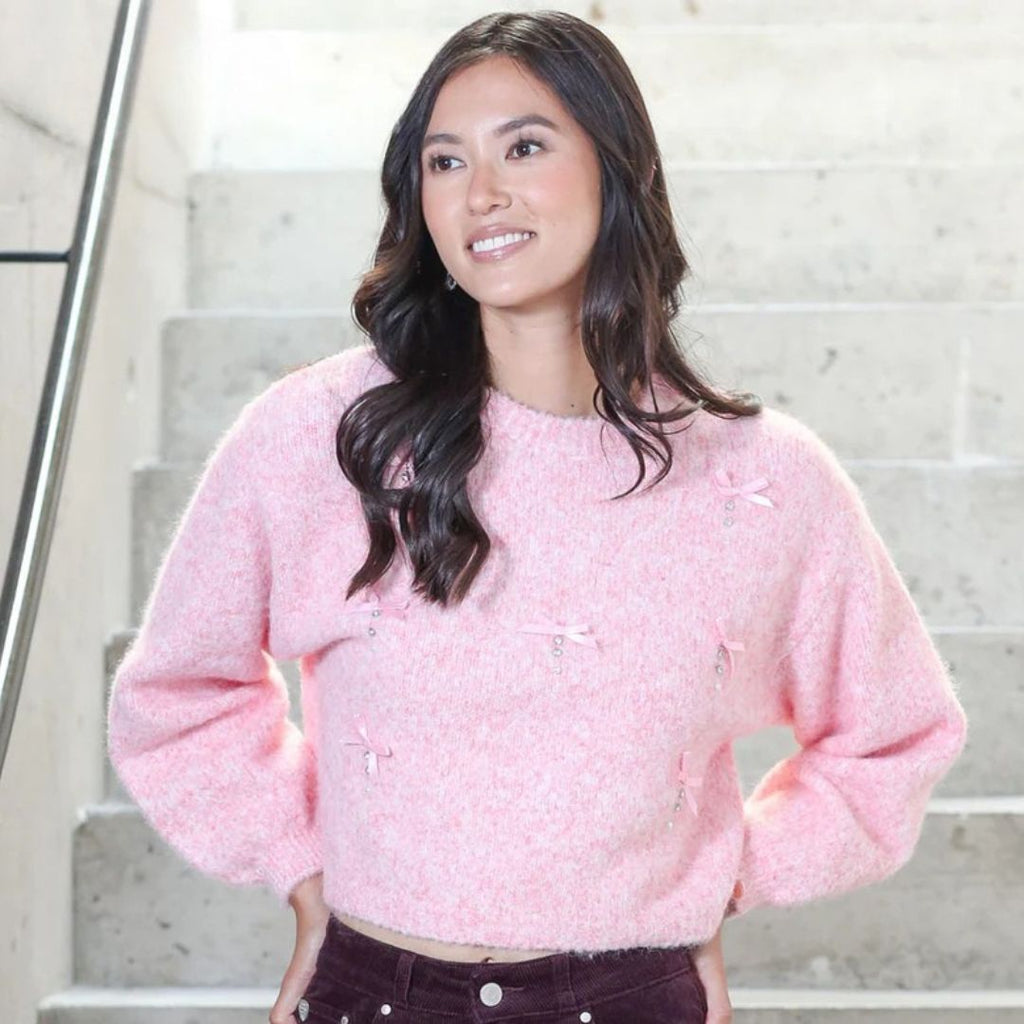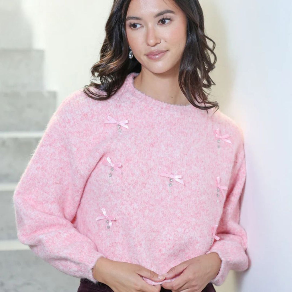 Cute cosy jumper in a delightful pink hue. Featuring pink bows & diamante's. This stylish sweater is crafted from soft, breathable fabric, ensuring all-day comfort while making a bold fashion statement. Its versatile design pairs effortlessly with your favourite jeans, making it perfect for both relaxed outings and chic gatherings.