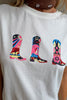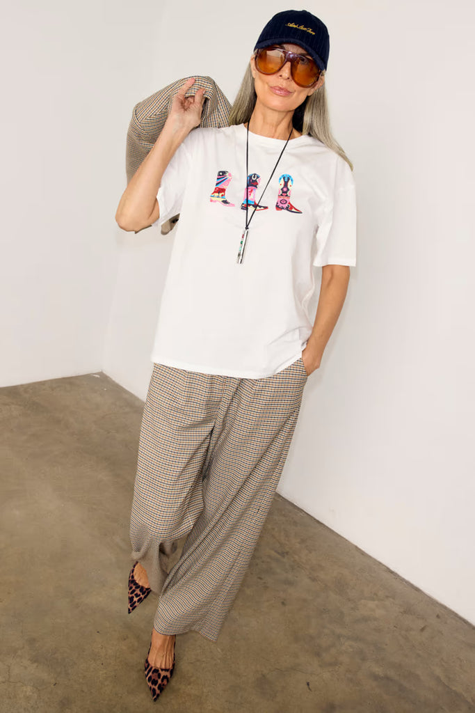 A soft cotton tee, with a boxy relaxed fit and drop shoulder. With a cute cowboy boot print. Great to throw on with some scallop jeans, or dress up with a cowboy boot.