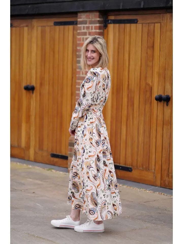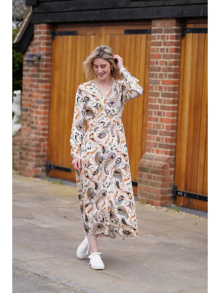 Pretty empire waist dress design, with pockets, and tab sleeves is a versatile style that can be worn with sleeves at full length for a crisp, clean look or rolled into three-quarter length for a casual feel. The fitted waist and gathered long skirt make a great silhouette. This dress has everything you could ask for.