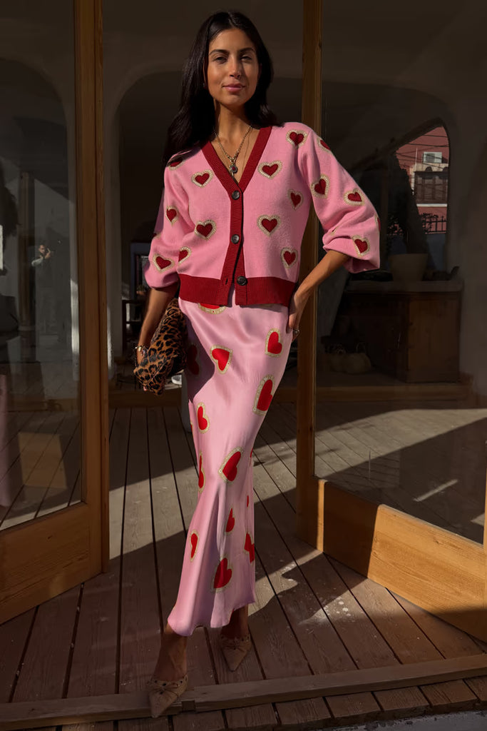 This fabulous pink heart maxi skirt. Elasticated waistband for comfort. The perfect multi seasonal piece that can be worn through into summer. Pair with a simple tee and sneakers or dress up with a blazer and some kitten heels.