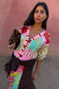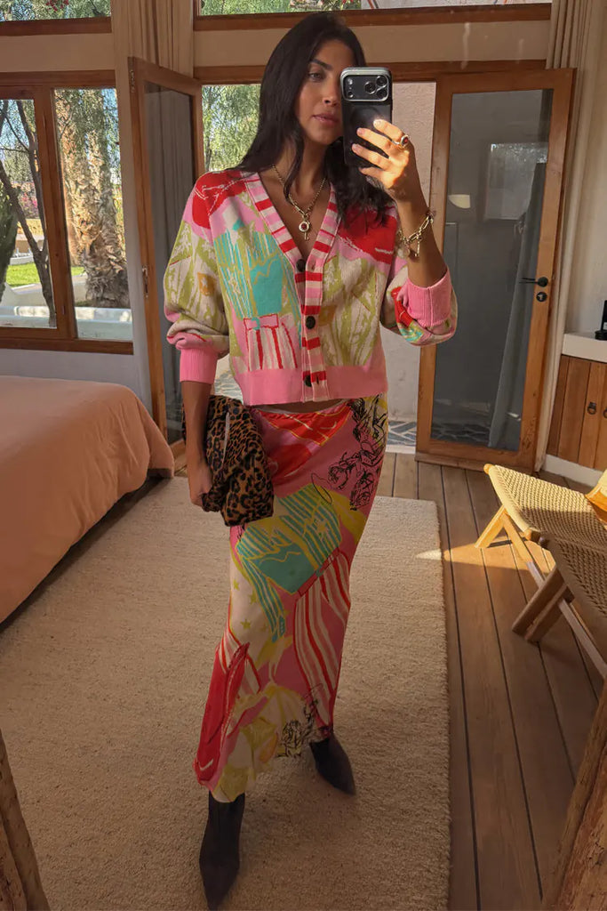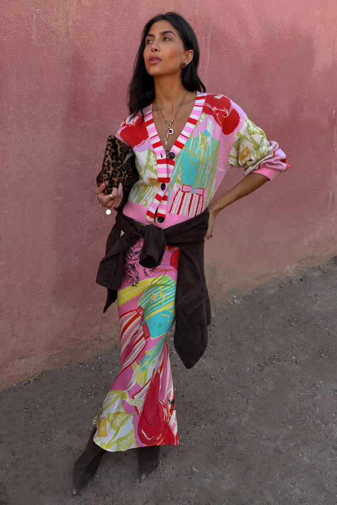 Beautiful weighty knit, soft touch and a definite wardrobe staple! Features abstract cowboy silhouettes and cowgirl motifs. A bright and bold colourway, with the pink stripe detailing on the button stand adding an extra touch of flare. Pair with the matching maxi skirt for the perfect feel good throw on! Features button up fastening.